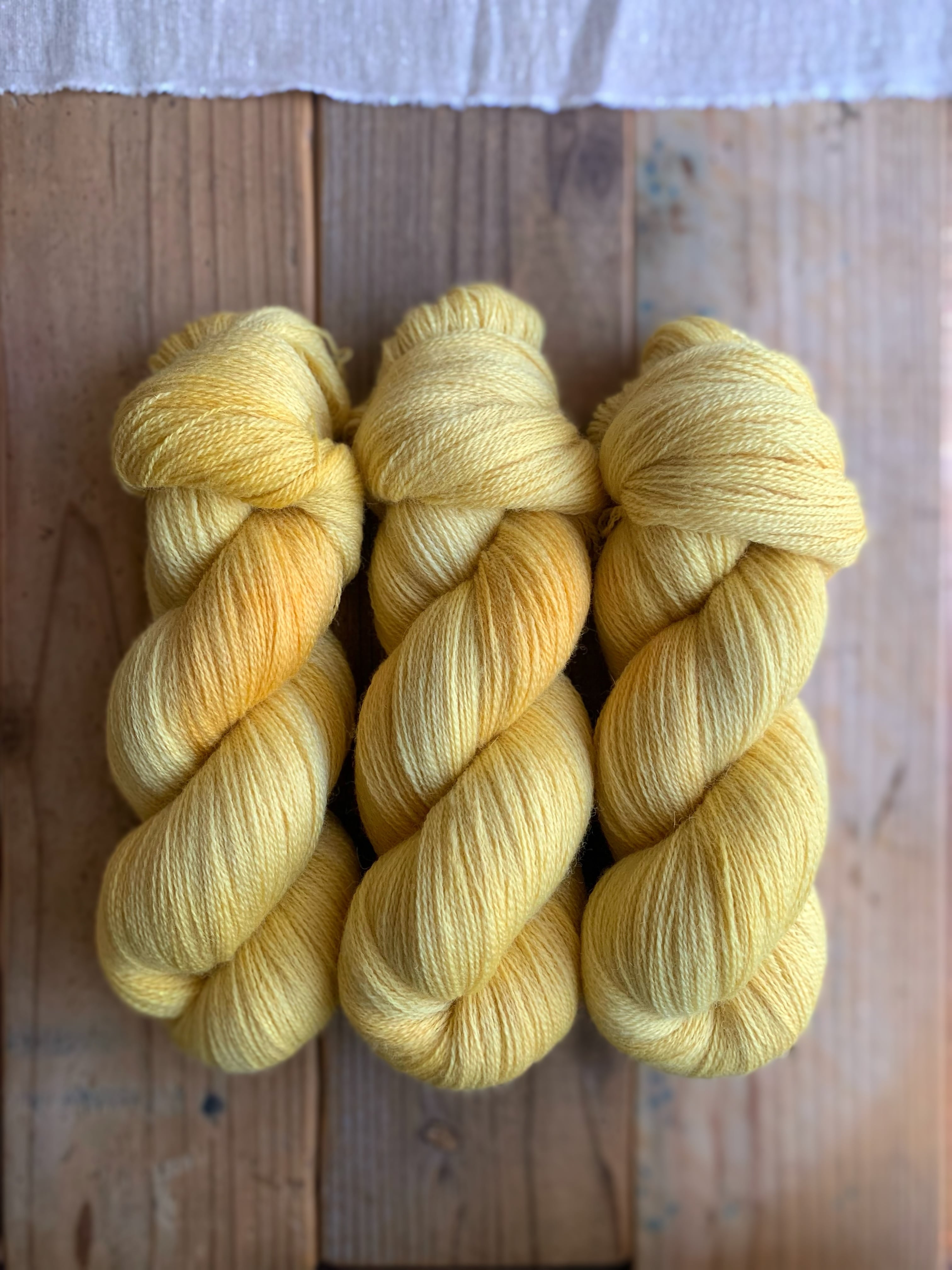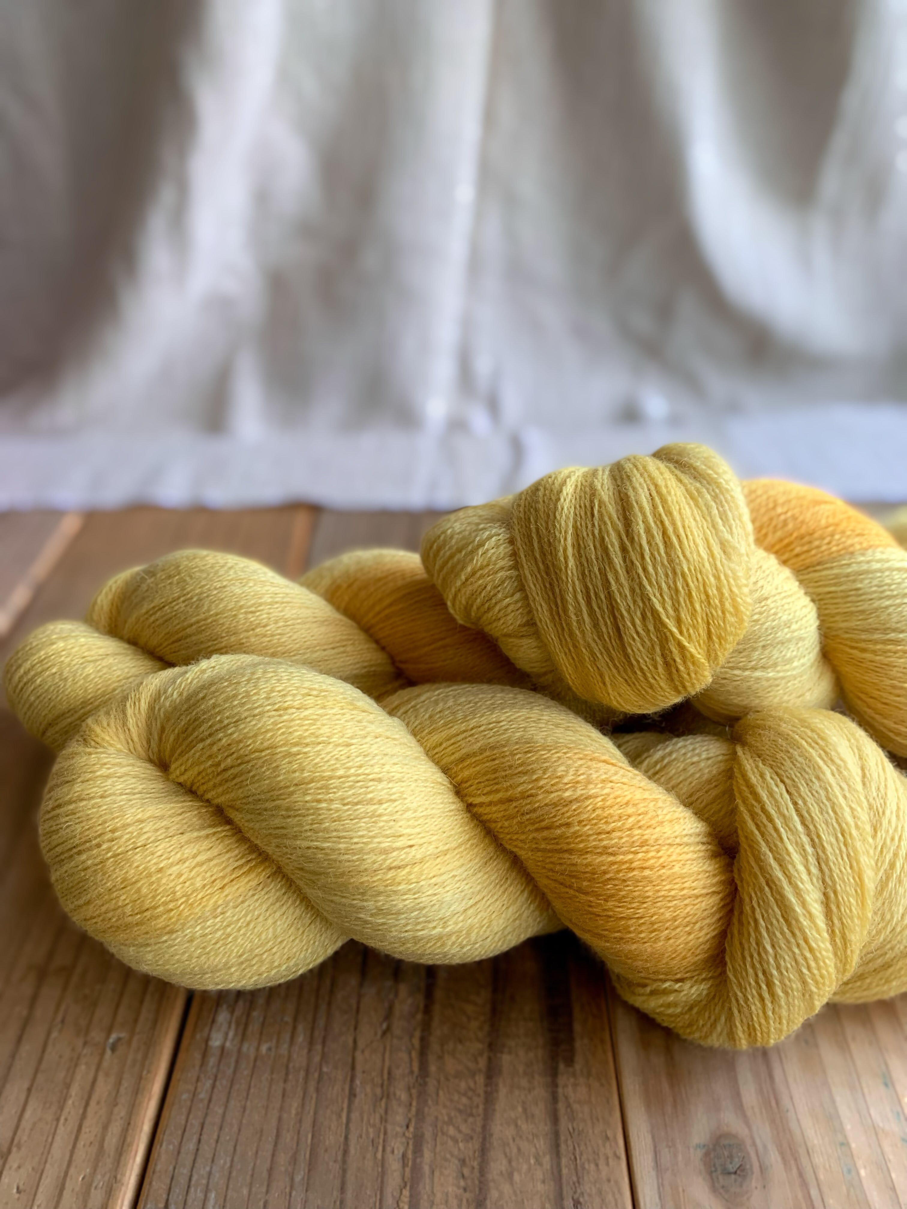 春になると染めたくなるひよこみたいなカラー。染色中に頭の中に浮かんできた”バナナ”というワードも一緒に色名にしちゃいました。レース糸は1本で編んだり、写真のように夏糸と引き揃えてウエアーを編むのもおすすめです。